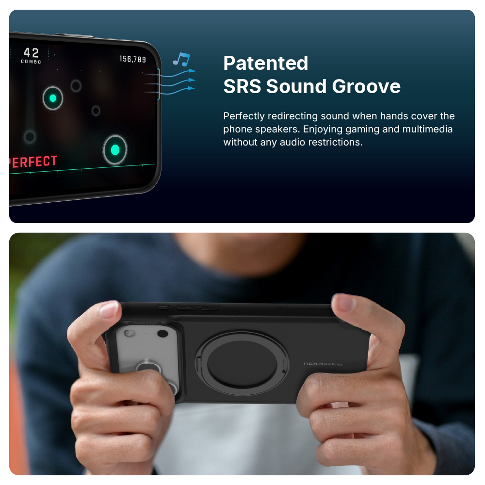 | SRS Sounds Redirect: Patented SRS structure designed to prevent any volume reduction by normal phone case, and can fully optimize the sound quality.
