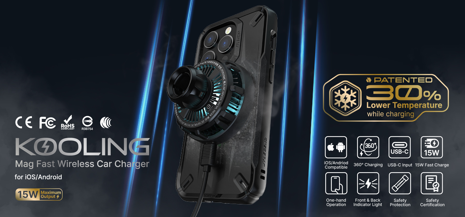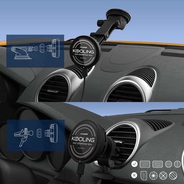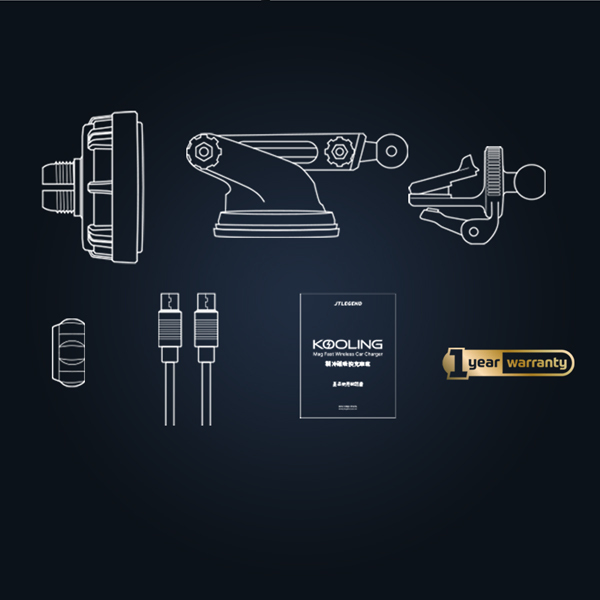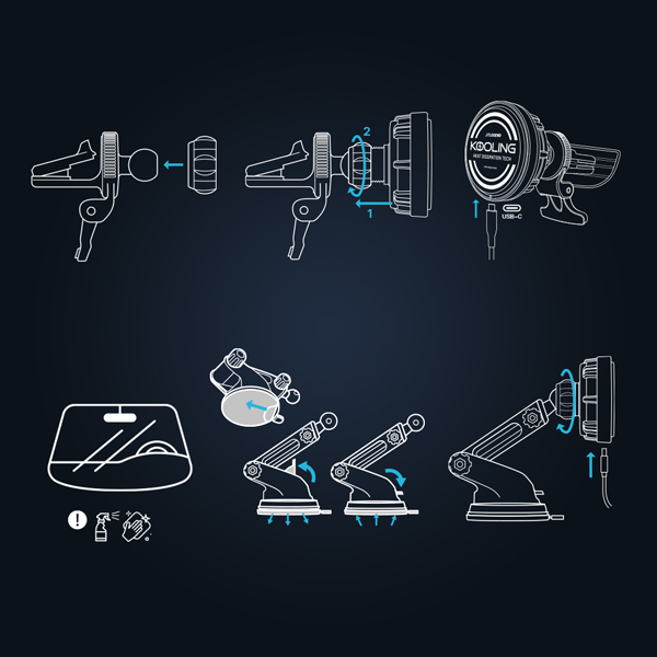 Package Content: Kooling Mag wireless car charging mount/Suction cup holder/Air vent clip holder/Installation ring/USB-C cable/Product manual