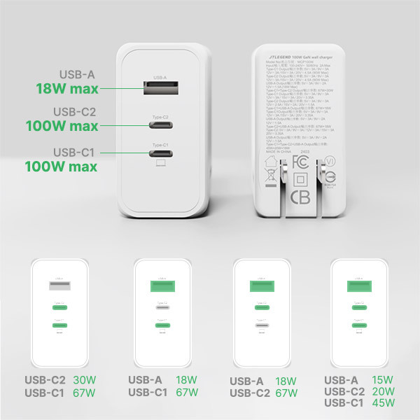 USB-C2: 5V=3A/9V=3A/12V=3A/15V=3A/20V=5A (100W Max)